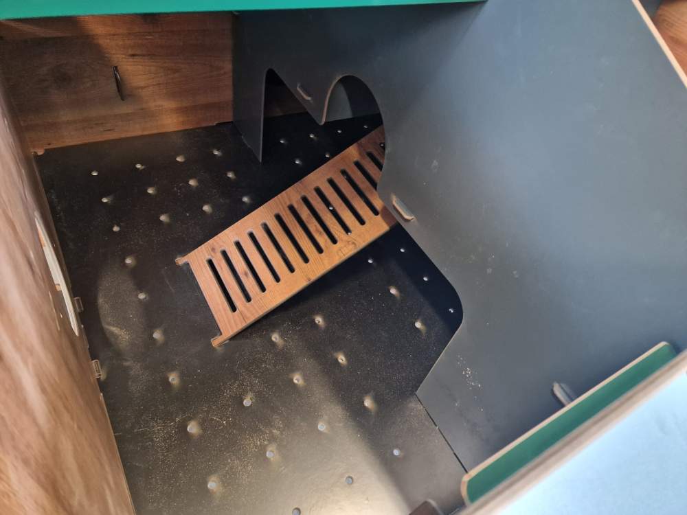 Kaninchenhaus 30 cm über dem Boden erhöht mit einer komfortablen gemeinsamen ersten Etage und eine Innentreppe, die in die zweite Etage führt, wo sich zwei bequeme Nester befinden.
