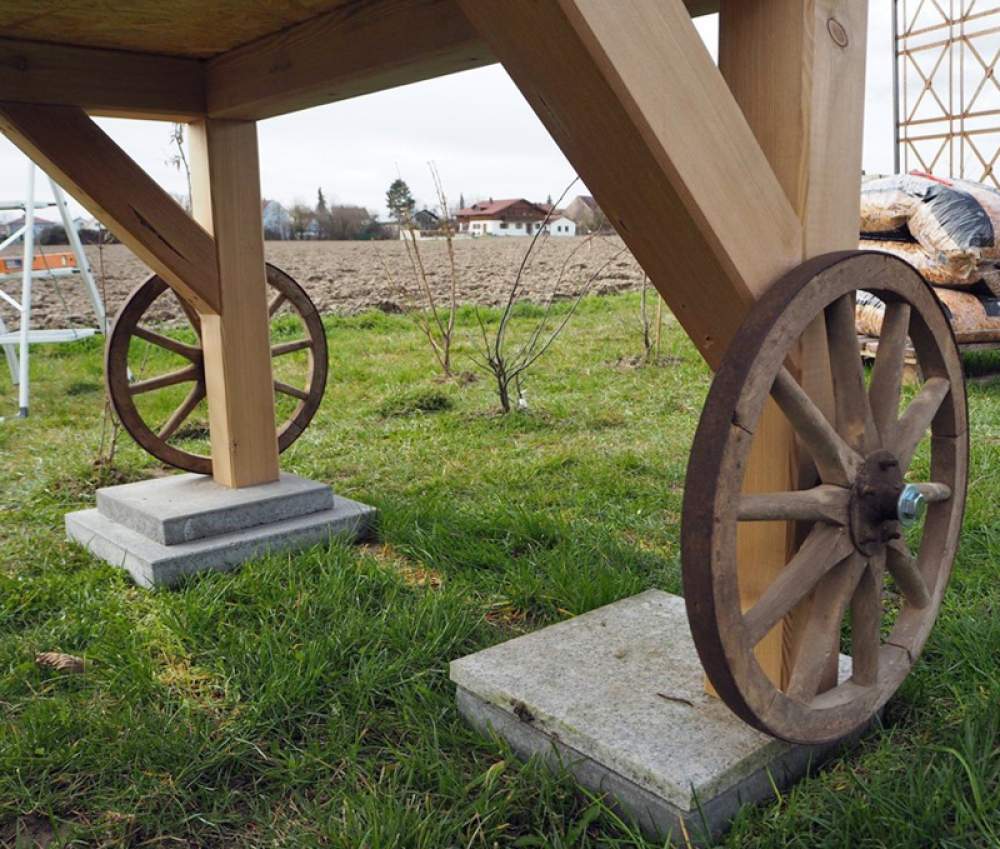 -An diesem Holzrahmen werden die Wagenräder als Deko montiert.