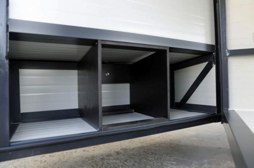 Die Wände bestehen aus 40 mm Sandwichplatten in RAL 7016 Anthrazitgrau, die Kanten in RAL 9006 Weißaluminium ( verzinkte Stahlkonstruktion Aufpreis 250,00 € )