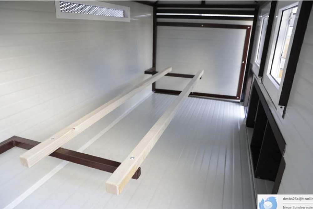 Die Wände bestehen aus 40 mm Sandwichplatten in RAL 9002 Grauweiß, die Kanten in RAL 3009 Oxidrot ( verzinkte Stahlkonstruktion Aufpreis 250,00 € )